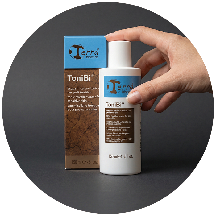Detergi la pelle delicatamente con l’acqua micellare ToniBi® ricca di oli biologici riequilibranti. Aiutati con un dischetto di cotone. Svolge anche azione tonica, astringente e idratante e non necessita di risciacquo.