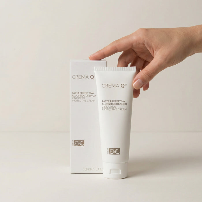 Stendi uno strato sottile di Crema Q® una pasta protettiva all’ossido di zinco che aiuta a mantenere la pelle del culetto protetta dal contatto con pipì e feci, rinforzando la delicata barriera idrolipidica e lenendo le irritazioni.