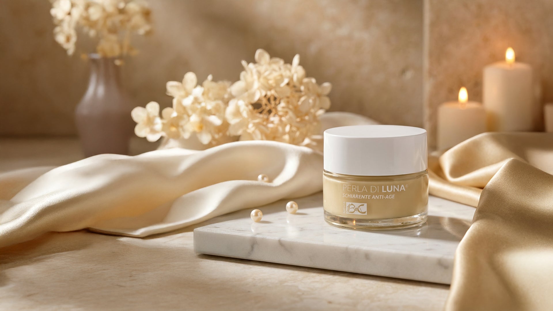 HOW IT WORKS: Glabridin purified from Glycyrrhiza glabra (licorice) and Melinjo extract (Gnetum) inhibit the tyrosinase enzyme responsible for the biosynthesis of melanin. Furthermore, Artocarpus heterophyllus (breadfruit) extract and Vit.B3 inhibit the transfer of melanin to keratinocytes, counteracting skin pigmentation. Retinol (Vit.A), Willow and Cumin extract and essential oils stimulate cell turnover and the natural exfoliation of the skin, promoting the removal of existing stains. Aloe extract, hyaluronic acid, olive unsaponifiables, Vit.E, Vit.C, Magnolia extract and Ribose have a profound nourishing and anti-aging action, defending the skin from free radicals, improving hydration (+12%) and elasticity (+4%) and reducing wrinkles (-21%) in just 2 weeks. In vivo test on a sample of 12 volunteers, Average age: 36.8 years, Gender: 7F; 5M; on artificially induced skin blemishes, monitored for 4 weeks, showed a faster lightening of the blemishes in the area treated with Perla di Luna compared to the untreated area (+38% lightening speed)